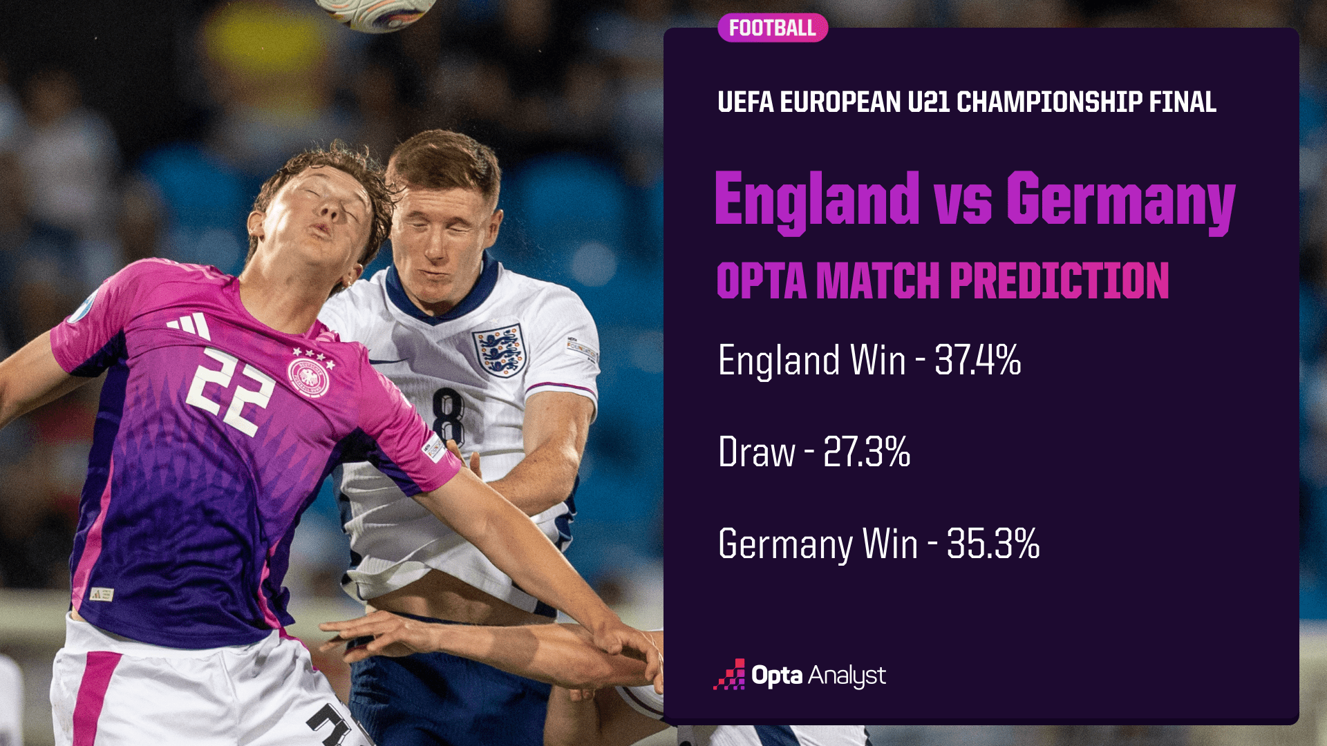 虎扑06月28日讯 U21欧青赛决赛宿敌英格兰与德国将再度狭路相逢。李-卡斯利(Lee Carsley)能否率领他的青年三狮军团成功卫冕?Opta对这场焦点战做出了赛前预测与分析。