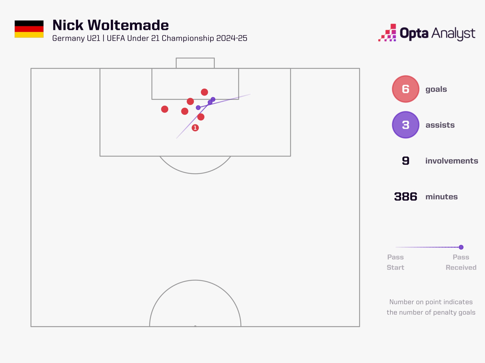 锋线明星沃尔特马德打出了本届赛事MVP级别的表现,他直接参与了9个进球(6球3助),这是Opta自2007年有记录以来,U21欧洲杯单届赛事中球员参与进球的最高纪录!他的关键传球数(12次)也仅次于斯洛伐克中场托马什-里戈(13次),射正次数则仅次于法国新星特尔。