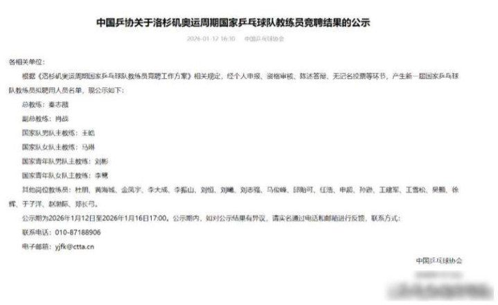 洛杉矶奥运周期快到了,国乒教练名单终于定了,多哈赛刚输完没两天,大家等着看结果,黄海城回来了,他带过孙颖莎,于子洋也进了教练组,成绩一般,秦志戬头发最白,直接当了总教练。