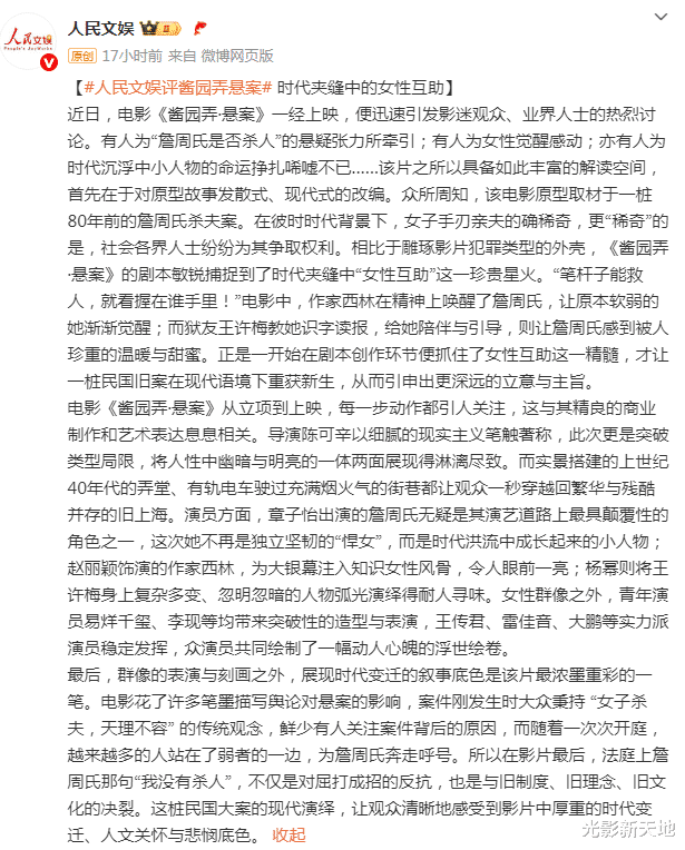 另一个方向是给演员打差评,引导赵丽颖和杨幂两家粉丝互撕,用演员在电影中的表现互相拉踩。人民文娱在文中对各个演员都有中肯评价,电影是集体创作,演员需要默契配合,这样才能实现1+1大于2的效果,《酱园弄·悬案》里,众演员共同绘制了一幅动人的浮世绘卷。